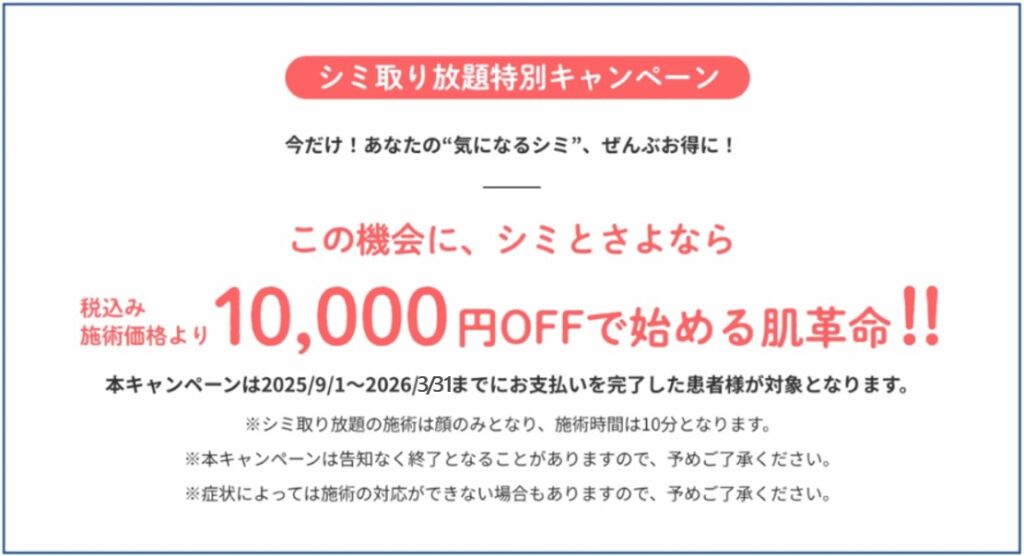 アイシークリニック上野院では、気になるシミをお得に取っていく「シミ取り放題」を特別価格で通常価格より1万円OFF(29,800円→19,800円)でご提供する【キャンペーン】を実施しています。