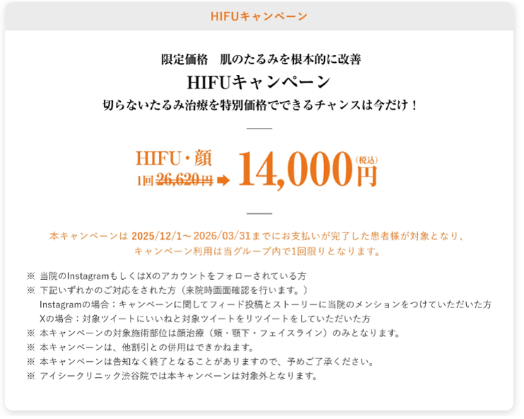 アイシークリニック上野院では、HIFU治療のキャンペーンを実施致します。