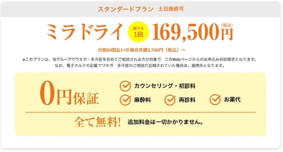 | ⚡ ミラドライ | 患部にマイクロ波を照射※ワキのみ | × | 200,000~400,000円(税込220,000~440,000円) | ・多汗症とワキガ治療が同時にできる・1〜2回の治療で改善する | 保険が適用されない |